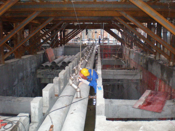 針對作業(yè)面在地下負(fù)二層,光線較差、通風(fēng)不暢,同時土建單位正在拆除臨時支撐,施工現(xiàn)場工作環(huán)境相當(dāng)惡劣等情況。為保證現(xiàn)場施工正常有序的進行和施工人員身體健康,項目部采取相應(yīng)措施保證了整個現(xiàn)場的安全、照明、通風(fēng)。施工人員發(fā)揚四化建吃苦耐勞、敢打敢拼的精神,長期冒雨作業(yè)。吊裝中有吊機運行不到的地方,就積極開動腦筋,用技巧、經(jīng)驗和人力,保證前期設(shè)備及管道的吊裝倒運,為后期的施工做好了良好的鋪墊。