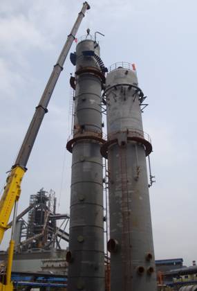 中午,吊車第二次移位,準(zhǔn)備吊裝高7.9米(總高44.6米)、重17噸的洗苯塔上節(jié)。下午2點(diǎn),洗苯塔上節(jié)開始組對焊接,至下午4點(diǎn)順利完成。吊車進(jìn)行第三次移位,準(zhǔn)備吊裝高21米、重39.5噸的水洗塔。5點(diǎn)30分,水洗塔順利完成吊裝。