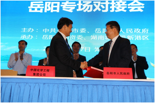 余津勃代表中國化學工程集團公司,作為第一個央企代表與岳陽市委常委、市政府常務副市長唐道明簽訂岳陽市人民政府—中國化學工程集團公司戰略合作框架協議。協議內容為:岳陽市人民政府支持中國化學集團公司在岳陽市范圍內依法合規開展化學工程項目建設、危化管網改造、城市地下管網建設、化工管道安裝和其他市政、環保、工業廢棄場地處理等項目建設,并在項目前期調研、項目實施提供支持并營造好的環境,協調在岳項目地履行合同辦理所涉及各項行政審批義務。中國化學集團公司協調所屬工程公司、基金公司、財務公司在岳陽市區域內完成項目投資和投融資支持。2016年首批啟動“四化建商業綜合體建設工程”等項目。