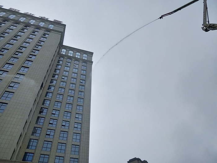 6月22日上午9時30分,四化大廈9樓濃煙滾滾,樓內警鈴大作,員工們手拿濕毛巾,捂住口鼻從樓內消防通道快速有序的撒離疏散到安全地帶,工作人員不時提醒疏散人員清點人數,報告傷亡情況和穩定情緒。不到兩分鐘時間,兩臺消防車風馳電掣的駛入大廈院內,全副武裝的消防隊員快速啟動消防裝備,分兩路進行救援和滅火。不一會兒,樓內滅火隊員和消防云梯車幾乎同時噴出水柱直達20樓頂。