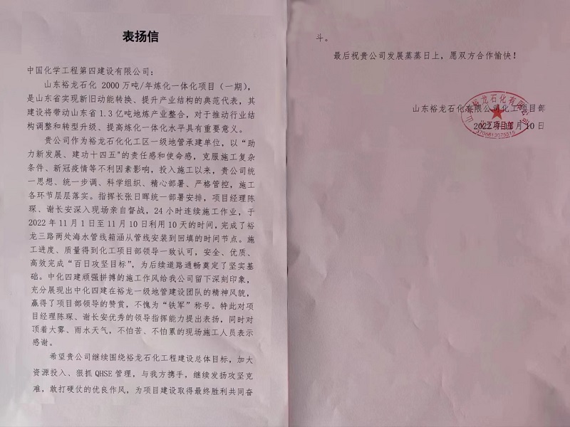 11月11日,公司收到山東裕龍石化有限公司化工項目部發來表揚信,對中化勞務公司承建的15號、16號箱涵海水管承臺保質保量完成節點目標,為裕龍石化項目順利實施作出的貢獻,給予表揚和感謝。
