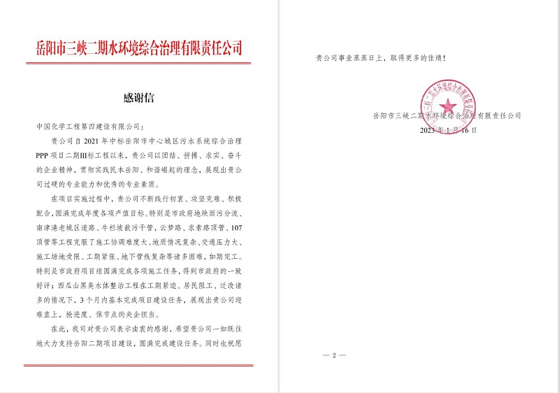 1月16日,岳陽市中心城區(qū)污水系統(tǒng)綜合治理項目部收到岳陽市三峽二期水環(huán)境綜合治理有限責(zé)任公司發(fā)來的感謝信。