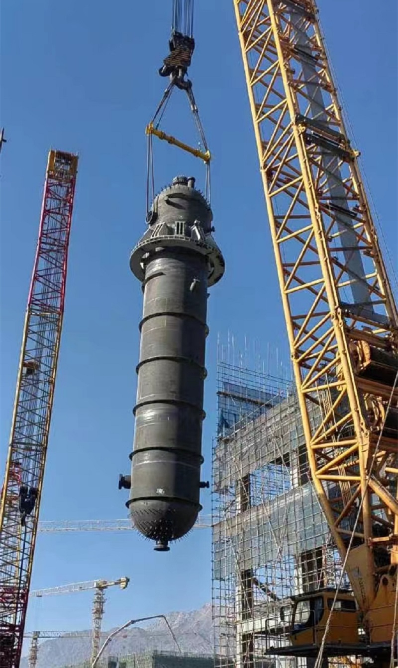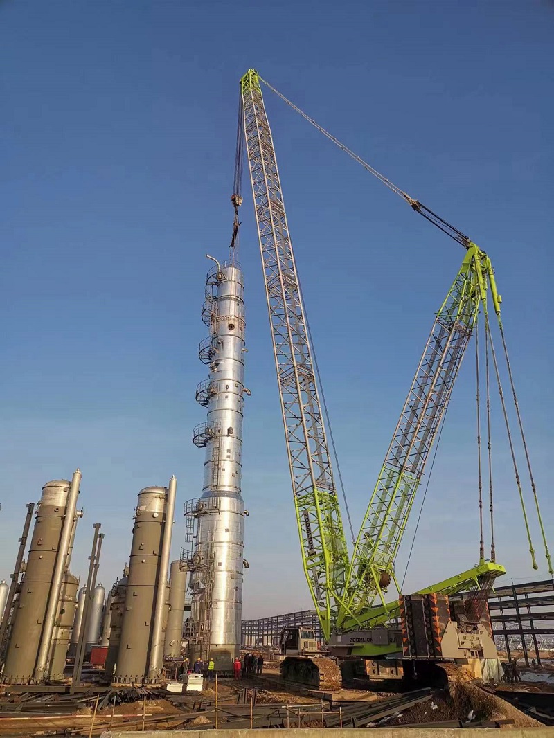 該甲醛吸收塔直徑 4.4米、高74米、重118噸,是該項(xiàng)目現(xiàn)場(chǎng)最大、最重設(shè)備。在吊裝中,項(xiàng)目施工人員采用抬運(yùn)法,即以265噸履帶吊為主吊,180噸履帶吊輔助,兩輛吊車相互配合、緊密協(xié)作,順利完成甲醛吸收塔吊裝。