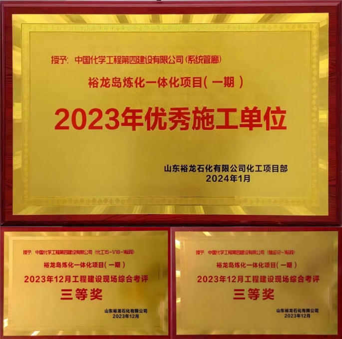 近日,公司山東裕龍石化項目部獲評山東裕龍石化有限公司2023年優秀施工單位,項目化工15-1/16-1標段和儲運12-1標段在山東裕龍石化有限公司2023年12月工程建設現場綜合考評中分別獲三等獎。