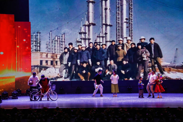 “青春逢盛世,奮斗正當時,化建青年,戰!”來自市政工程公司大型歌舞劇《盛世奮斗正青春》擲地有聲,傳遞出四化建70年崢嶸歲月間,一批批青年突擊隊員們砥礪奮進、攻堅克難的化建湘軍精神,他們用青春火紅的芳華換來保交樓房千萬間,一句句為黨為人民的錚錚誓言在劇場內回蕩。從荒原曠野到大漠孤煙,從五湖四海到大江南北,美輪美奐的舞蹈輪番上演,蘊含著四化青年磅礴的青春力量,奏響起盛世奮斗的強音,為觀眾們送上了一場視覺文化盛宴。