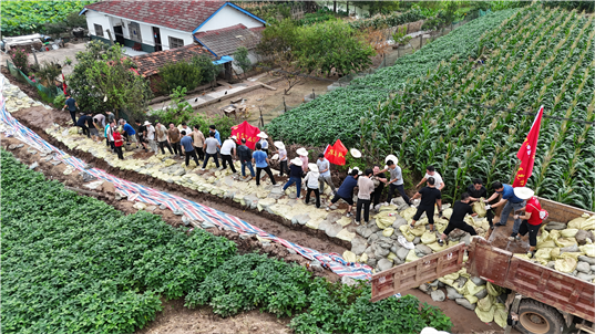 13日,公司機關總部全體員工主動申請參與搶建工作,從臨近退休的“老大姐”到剛入職的“小年輕”,從入黨多年的老黨員到佩戴團徽的青年突擊隊隊員,裝運沙袋、鋪設油布,沒有一個人叫苦叫累。到7月16日晚,第三道防線已完成所有堤防加固、彩條布鋪設、路口封閉和沙袋預留、現場清理等工作,在洞庭湖畔筑起了一道新的“長城”。