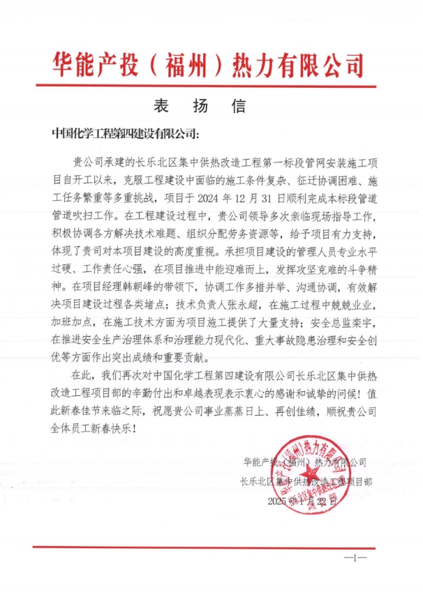 近日,東北公司收到華能產(chǎn)投(福州)熱力有限公司發(fā)來的表?yè)P(yáng)信,對(duì)東北公司在項(xiàng)目建設(shè)中高質(zhì)高效完成施工任務(wù)給予高度肯定與誠(chéng)摯感謝。