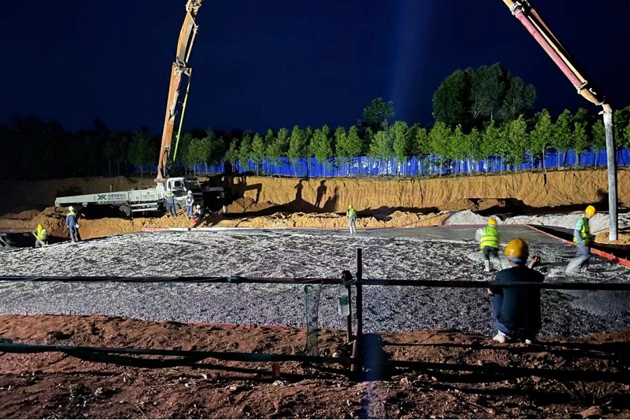 該項目位于崇左市中泰產業園東北部,過往車輛繁多,土地中遍布頑石,施工空間壓力與工期壓力并存。在工期的緊迫形勢下,項目部調整施工計劃,增加現場施工人員和設備物資投入,并合理組織施工資源。白天,70余名工人揮汗如雨;夜間,混凝土澆筑連續不斷,在嚴格遵守項目部保安全、抓質量的施工標準下,全體員工不辭辛苦、主動作為,快速而穩健的推進項目工程建設。
