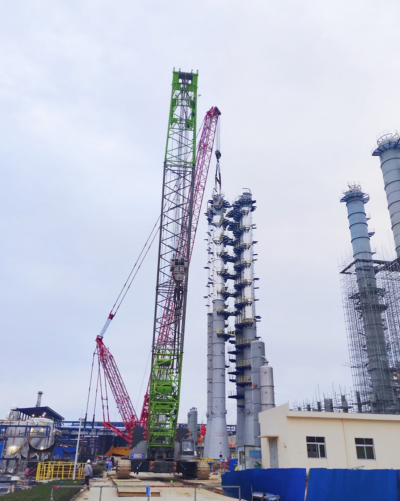 該項目大件設備共兩臺(T-602A/B),設備單重均為150噸。為順利完成此次吊裝任務,項目部采用高強度大規格鋼絲繩,在確認鋼絲繩額定負載和所有鋼絲繩完好情況下,現場多次進行起重低空試運行,確保一切正常后方正式起吊。在吊裝中,項目施工人員采用400噸和650噸兩臺履帶起重機,順利將大件設備吊裝就位,如期完成施工階段第一個關鍵節點,獲得業主、監理的一致贊譽。(通訊員 孫善義)