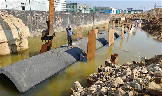 該雨水管道施工區(qū)域位于水下,管中線離海水僅有20米并與海相通,管道安裝難度大;同時,在開挖過程中,取水箱涵上面出現(xiàn)大量海水涌入導致土層坍塌。面對緊急情況,項目部連夜探討解決管道水中定位與對接問題,積極會商業(yè)主、監(jiān)理單位,積極探索解決問題的路徑和方法,最后決定因“水”制宜,采取水下澆注混凝土來解決此難點。施工人員在箱涵上方處,通過對預應力鋼筒混凝土管兩端頭進行預制管枕施工,淤泥層及碎石處采取預制閥板墊層,挖集水坑進行強排,并且全程用GPS和全站儀進行精確測量標高和定位,確保雨水管道安裝的準確性和穩(wěn)定性,順利完成管道水中施工作業(yè)。